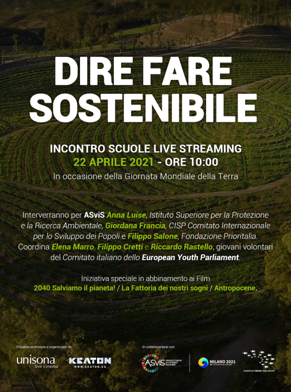 Dire Fare Sostenibile è stato promosso da Unisona in collaborazione con Keaton all’interno del tradizionale calendario di incontri annuali rivolti agli studenti. L’incontro del 22 Aprile 2021 ha visto il coinvolgimento di ASviS, Alleanza Italiana per lo Sviluppo Sostenibile, organizzazione nata nel 2016 per far crescere la consapevolezza dell’importanza dell'Agenda 2030 e per la promozione delle migliori pratiche per accompagnare la società italiana, i soggetti culturali ed economici e le istituzioni sul sentiero della sostenibilità.